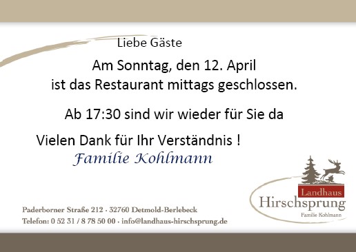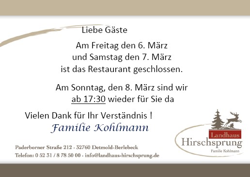 Das „Landhaus Hirschsprung“ ist ein Traditionshaus im grünen Detmolder Ortsteil Berlebeck. Das Landhaus Hirschsprung ist nicht nur ein Ort für gutes Essen, sondern auch für unvergessliche Momente. Genießen Sie einen Spaziergang durch die malerische Umgebung, erkunden Sie die Natur oder machen Sie eine Wanderung in der nahegelegenen Landschaft. Danach können Sie sich bei uns mit einem köstlichen Mahl belohnen und den Tag in vollen Zügen ausklingen lassen.