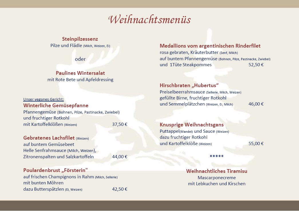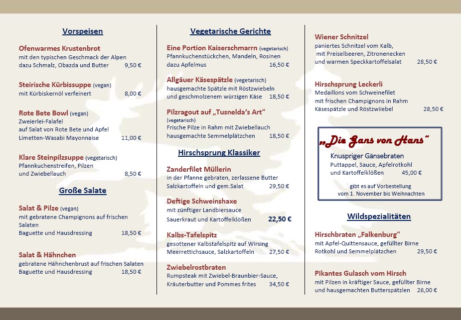 Unsere Speisekarte wechselt regelmäßig alle vier bis fünf Wochen. Diese Abwechslung wissen auch unsere zahlreichen Stammgäste zu schätzen, die zur jeweiligen Saison gerne Spargel- oder Matjesgerichte, Pfifferling-Spezialitäten oder unsere beliebte „GANS VON HANS“ genießen. Nur eines hat bei uns immer Saison: Wild. Haben Sie eigentlich schon einmal unsere Wild-Krakauer probiert? Eine echte Gaumenfreude!